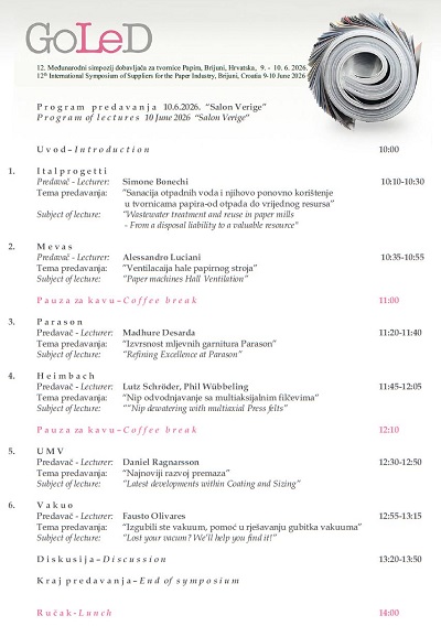 Došao je i taj čas! Pridružite nam se na 12. Međunarodnom simpoziju dobavljača za tvornice Papira, Brijuni, Hrvatska 4.-5. lipnja i dobijte najnovije vijesti iz svijeta proizvdnje papira. Vidimo se!